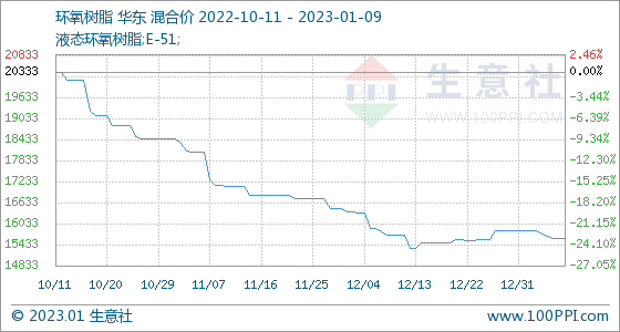 1月9日,生意社环氧树脂基准价为15600.00元/吨,与1月1日(15833.33元/吨)相比,下降了-1.47%。